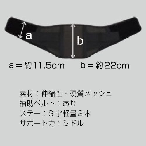 前合わせ部と背当て部に硬質メッシュ素材を使用。しっかりした生地で腰部の支持力を上げています。